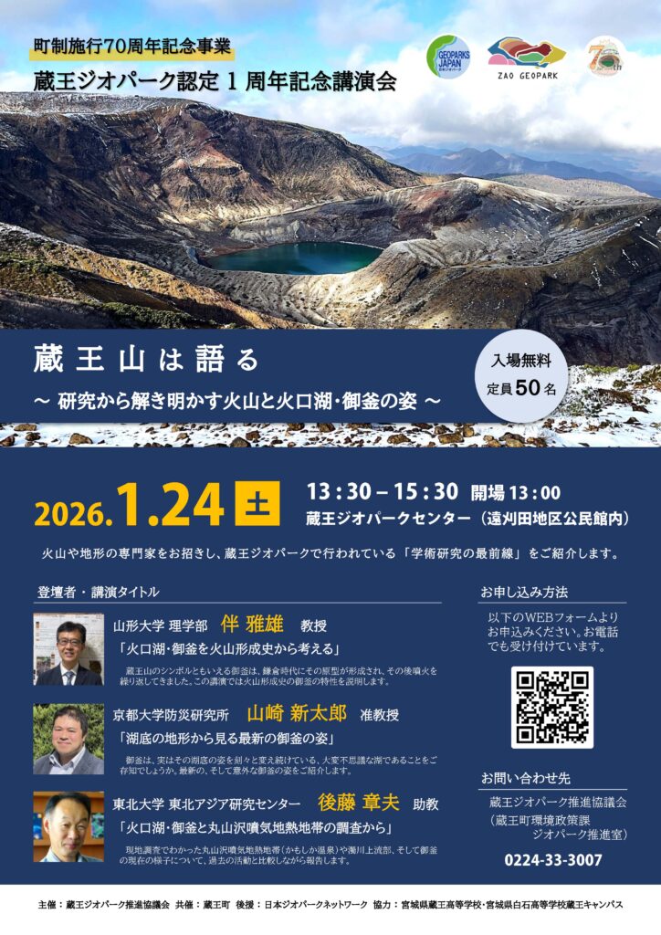 2025(R7)年1月に日本ジオパークに認定された蔵王ジオパークは、2026(R8)年1月に認定1周年を迎えます!この機会に、火山や地形の専門家をお招きし、蔵王ジオパークで行なわれている「研究の最前線」をご紹介します。